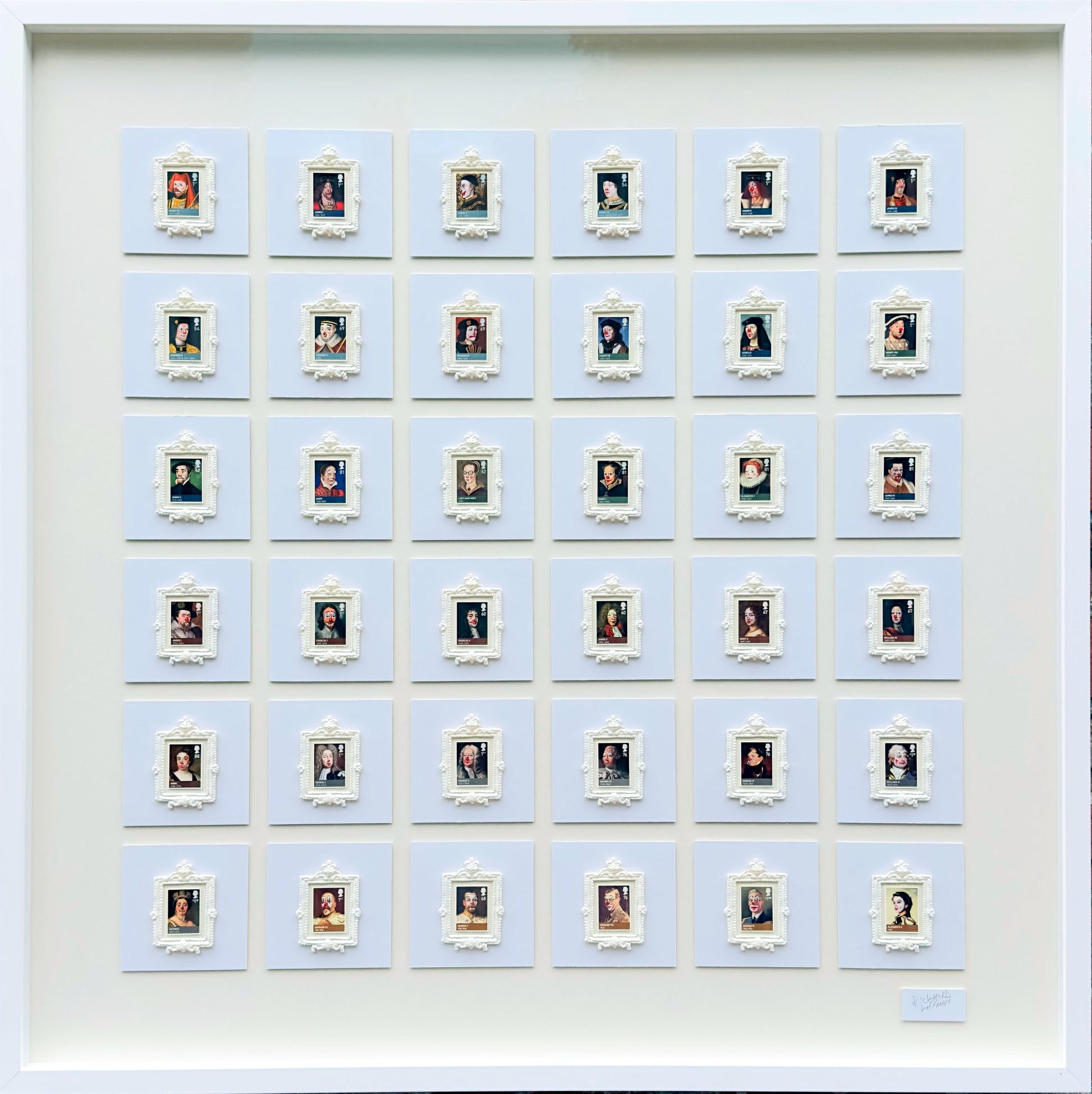 Over painted genuine postage stamps with handmade tiny frames. Framed in white hardwood frame, with Museum Acrylic.