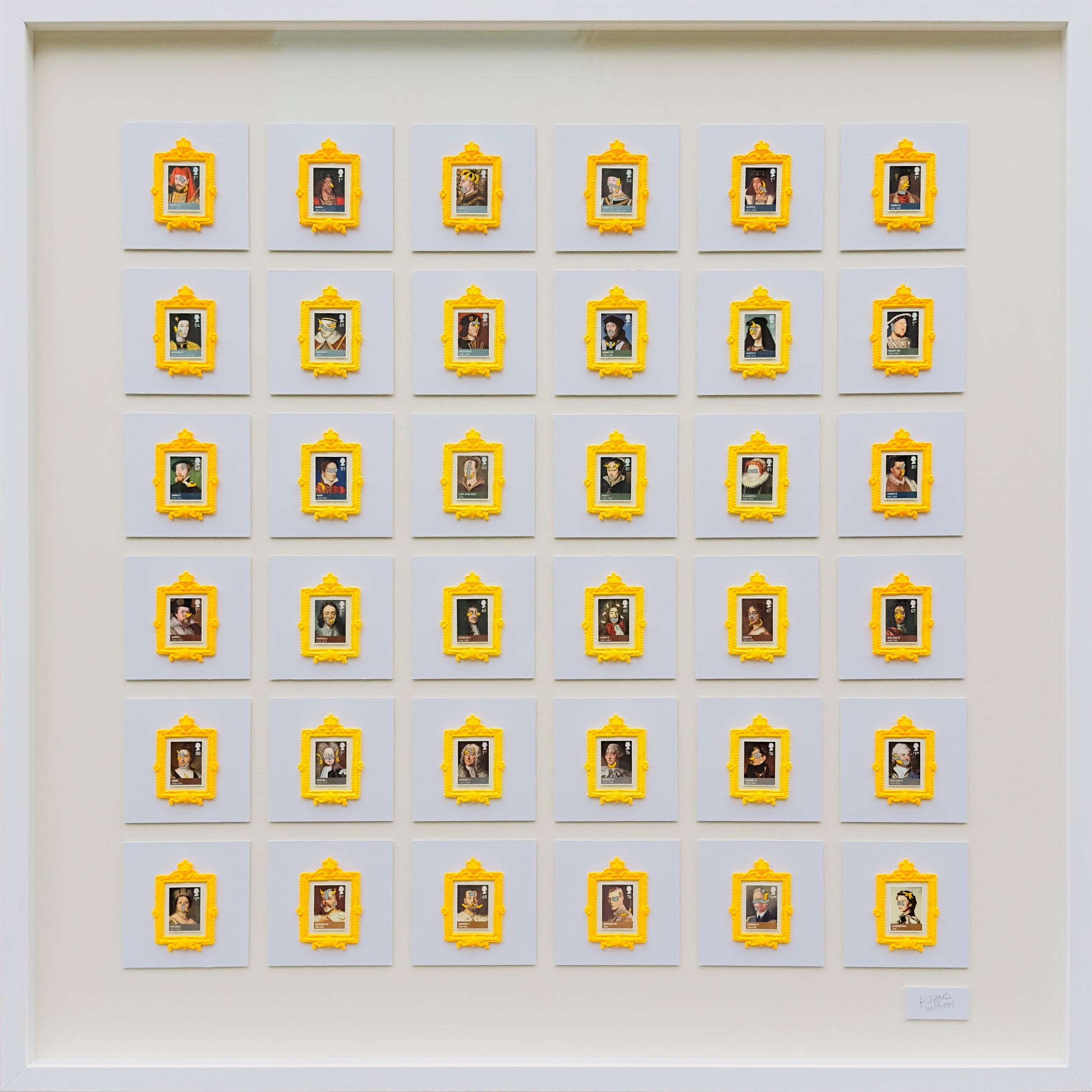 Over painted genuine postage stamps with handmade tiny frames. Framed in white hardwood frame, with Museum Acrylic.