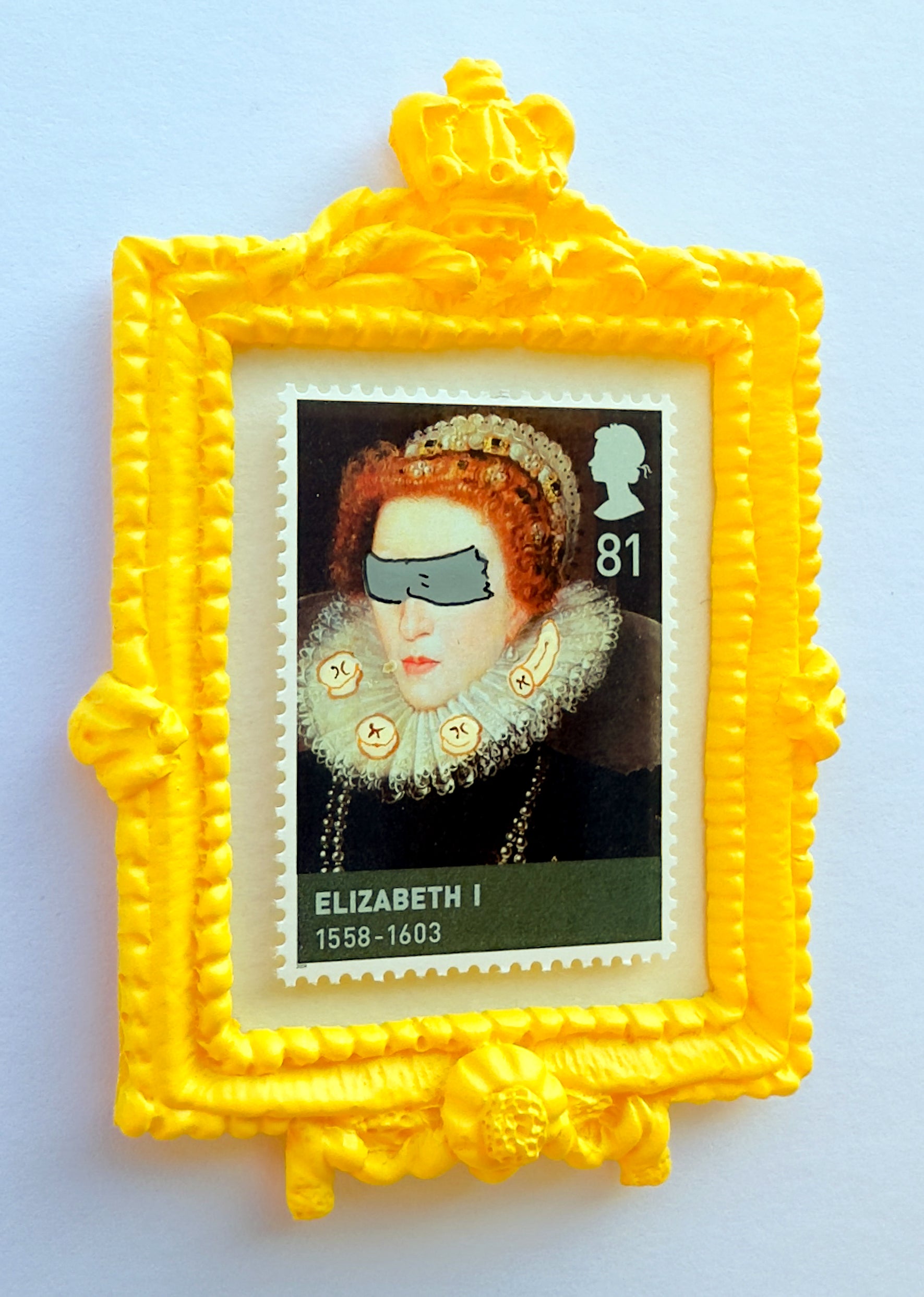 A witty nod to Maurizio Cattelan’s Comedian: regal figures brandish bananas affixed to their portraits with silver tape—transforming royal iconography into pop‑culture commentary, where powdered wigs meet street‑corner absurdity.